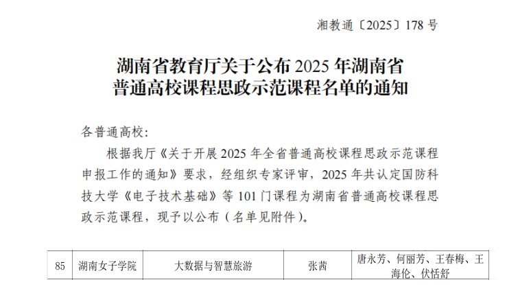 本网讯(旅游与航空管理学院 彭妍)近日,湖南省教育厅印发《关于公布2025年湖南省普通高校课程思政示范课程名单的通知》